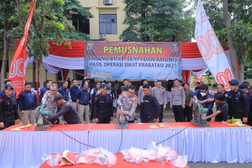 “Kami melakukan pemusnahan 50 pucuk senjata api dan amunisinya 85 butir hasil Operasi Sikat Krakatau dengan cara digerinda,” kata Kapolda Lampung Irjen Pol. Helmy Santika, saat konferensi pers hasil Operasi Krakatau 2025 di Mapolda Lampung, Senin.