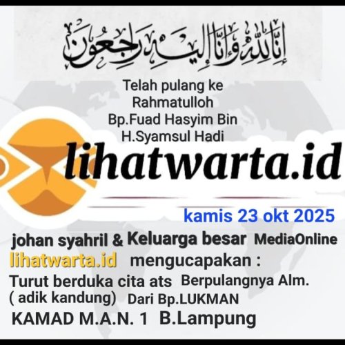 Bandar Lampung – wartaonelampung.com, 23 Oktober 2025 — Keluarga besar Media Online lihatwarta.id yang dipimpin oleh Johan Syahril turut berduka cita yang sedalam-dalamnya atas berpulangnya ke rahmatullah Almarhum Bapak Fuad Hasyim bin H. Syamsul Hadi, yang merupakan adik kandung dari Bapak Lukman, Kepala Madrasah MAN 1 Bandar Lampung.