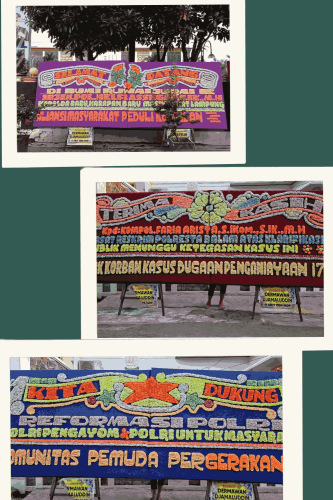 Tulisan di papan bunga itu berbunyi, “Terima Kasih Kepada Kombes Pol. Faria Arista A.S., S.I.Kom., S.I.K., M.H., Kasat Reskrim Polresta Bandar Lampung atas Klarifikasinya. Publik Menunggu Ketegasan Kasus Ini.”