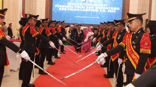 Bandar Lampung — wartaonelampung.com, Suasana penuh haru menyelimuti Gedung Serba Guna (GSG) Presisi Polda Lampung pada Kamis (13/11/2025). Kapolda Lampung Irjen Pol Helfy Assegaf secara resmi melepas 101 personel yang memasuki masa purnabakti Tahun Anggaran 2025 melalui upacara Pedang Pora yang khidmat.