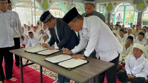 Kepala Lapas Kelas I Palembang, M. Pithra Jaya Saragih menandatangani Perjanjian Kerjasama dengan Ketua Yayasan Ponpes Khazanah Kebajikan, Imron Taslim, dan Ketua YAZRI, Andi Andrian.